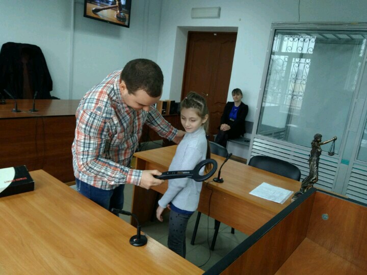 Потім учні зайшли до залу судового засідання, де їх дуже зацікавила клітка із органічного скла. На усі дитячі запитання відповідала керівник апарату суду. Алла Шевченко також розповіла учням які справи розглядаються у Зарічному районному суді м. Суми, як проходе судове засідання, хто працює в суді та відповіла на запитання.