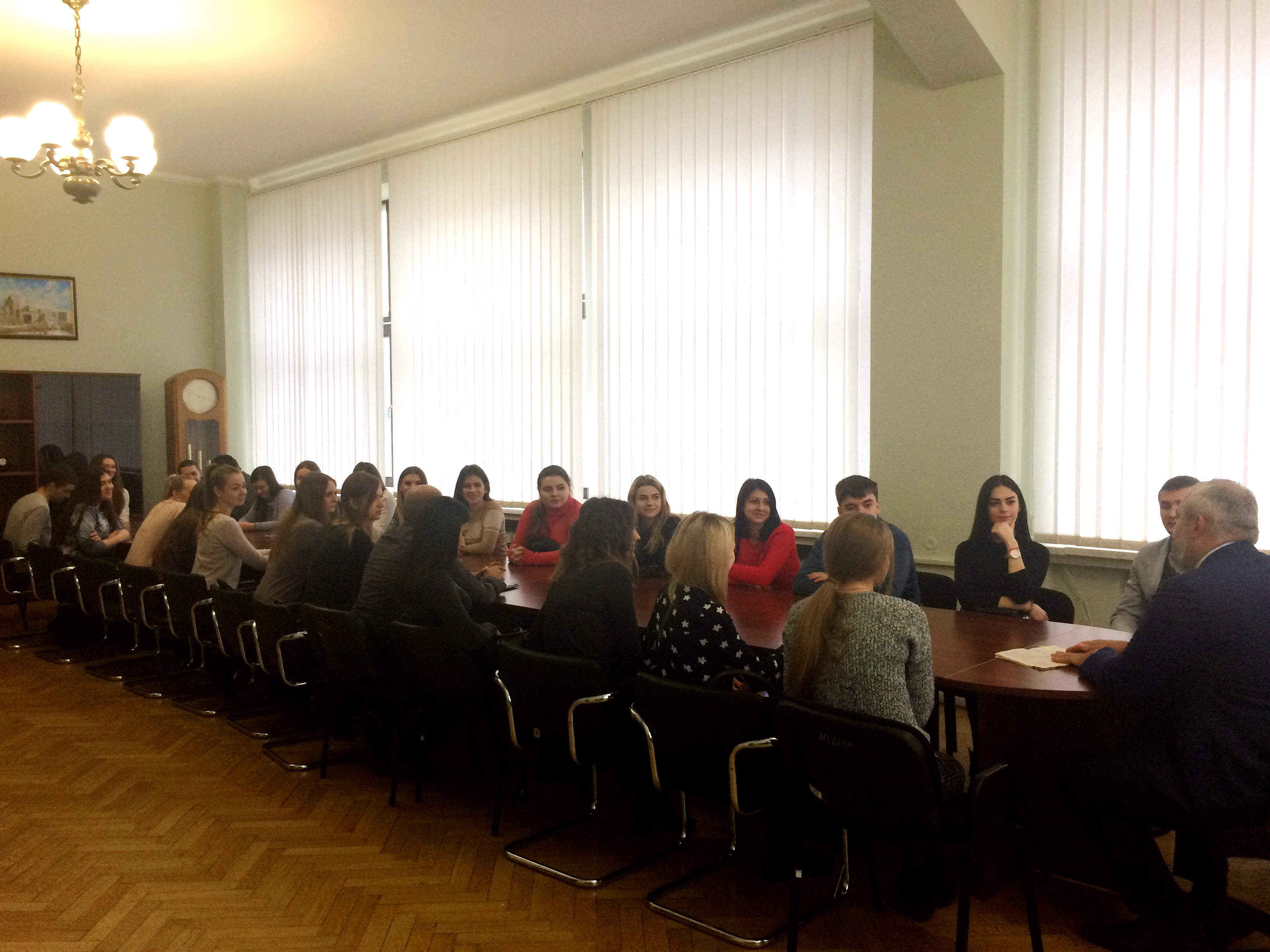 Голова суду Усатий Віталій Олександрович розповів присутнім, які справи розглядаються господарським судом та про діяльність суду. Пояснив, що судові засідання у суді є відкритими, крім випадків, установлених законом. Розповів студентам про посаду голови суду, керівника апарату суду та побажав студентам успіхів у навчанні.