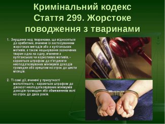 Так, 20.11.2017 Жовтневим районним судом м.Харкова було винесено вирок з кримінальної справи № 639/4580/17, яким уродженця м.Харкова визнано винним у скоєнні кримінального правопорушення, передбаченого ч. 1 ст. 299 КК України (жорстоке поводження з тваринами).