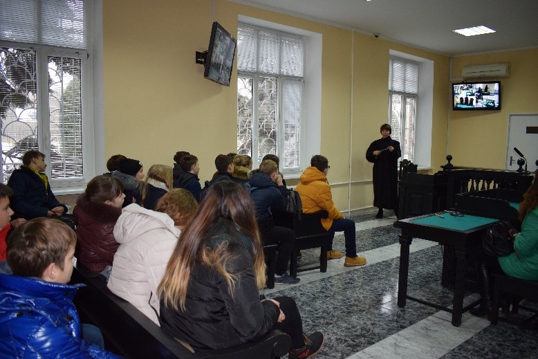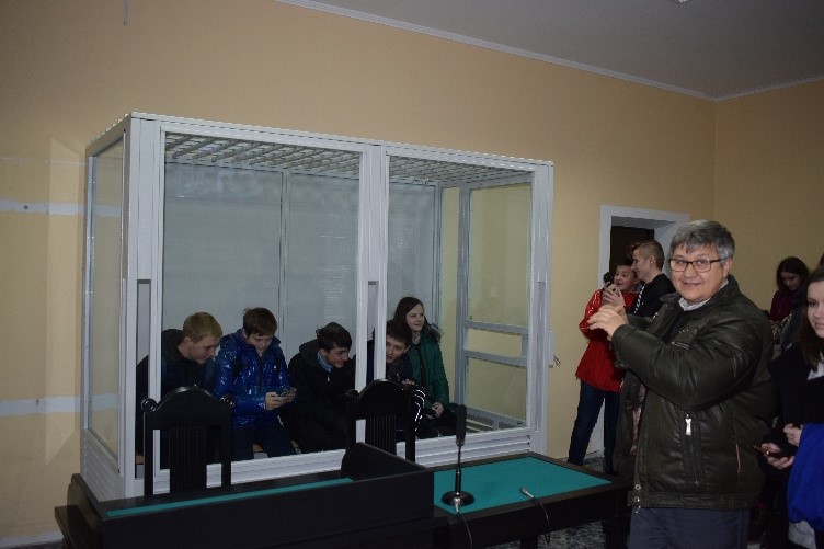 Після отриманої інформації учні мали можливість побувати в залі судових засідань, обладнаної сучасною технікою, де їм детально розказали про принцип роботи відеоконференцзв’язку. З не аби якою цікавістю гості оглянули сучасні заскляні загородження для підсудних, побували в ролі судді, інших учасників процесу та зробили фото на згадку.