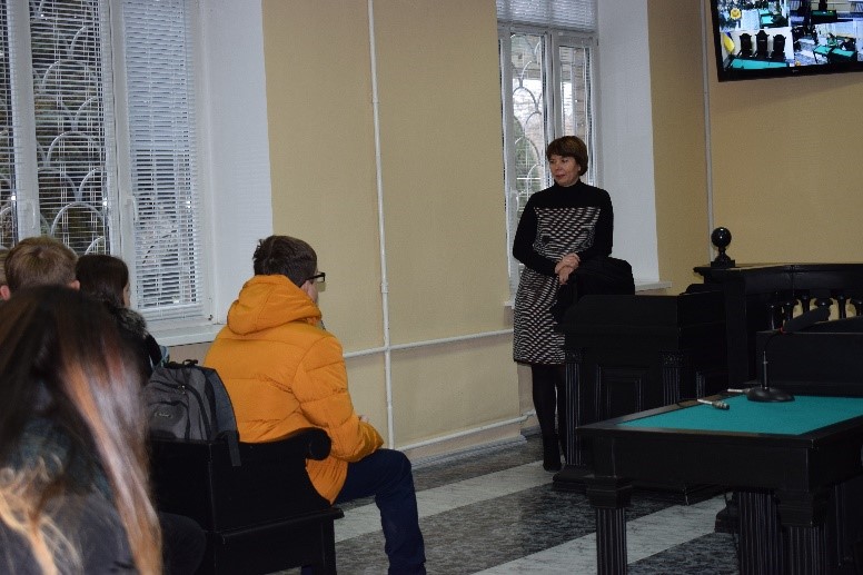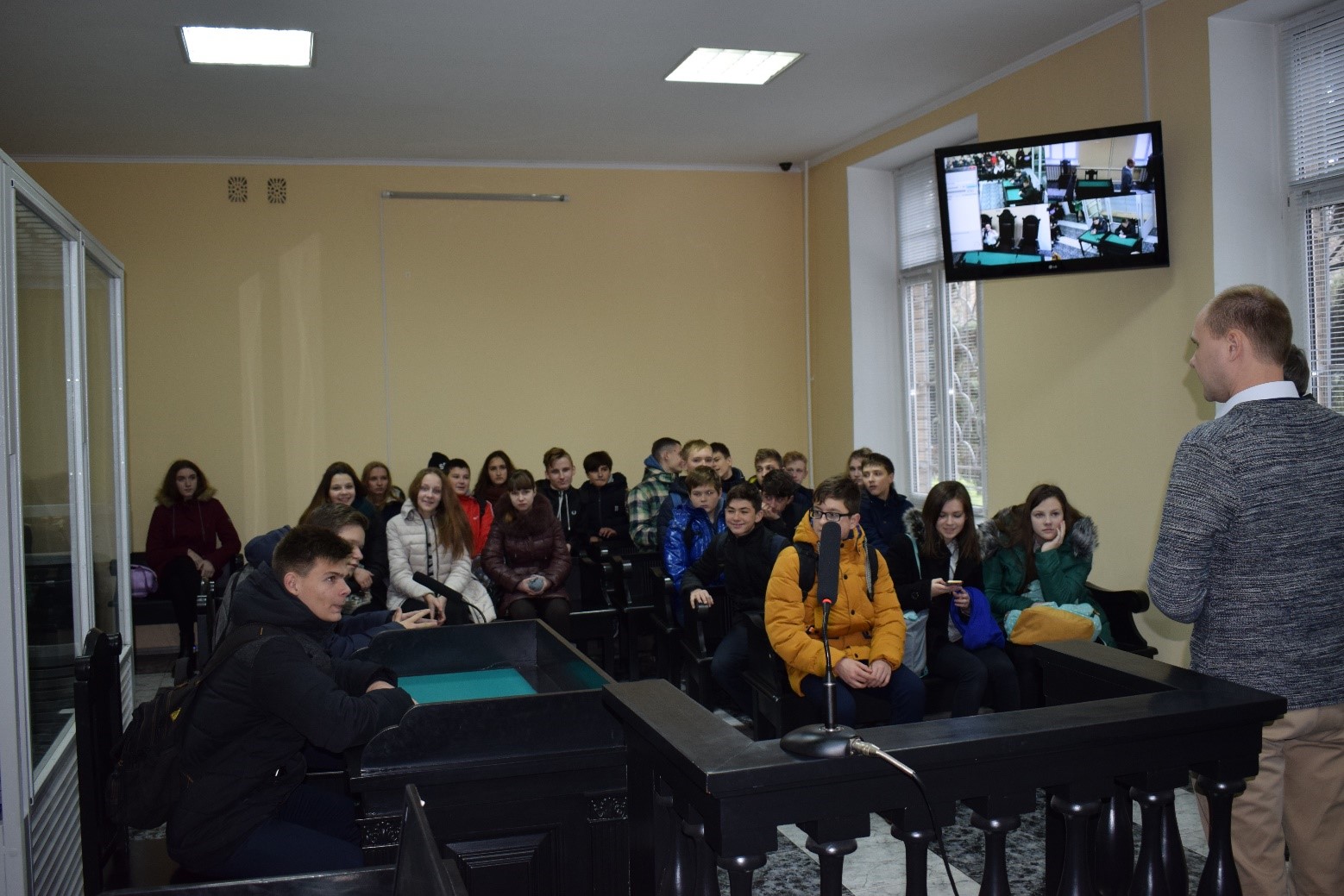 В залі судового засідання учнів привітала заступник голови апеляційного суду Олена Кузнєцова, яка розповіла про судову систему України, засади здійснення правосуддя, особливості роботи судових палат апеляційного суду та про свій життєвий шлях до посади судді. Дітям продемонстрували мантію та нагрудний знак судді, надали відповіді на поставлені запитання, які стосувались особистого досвіду роботи судді та останніх резонансних справ.