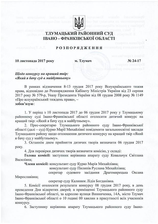 Тлумацький районний суд Івано-Франківської області оприлюднить результати конкурсу на кращий твір "Який я бачу суд в майбутньому" 8 грудня 2017 року