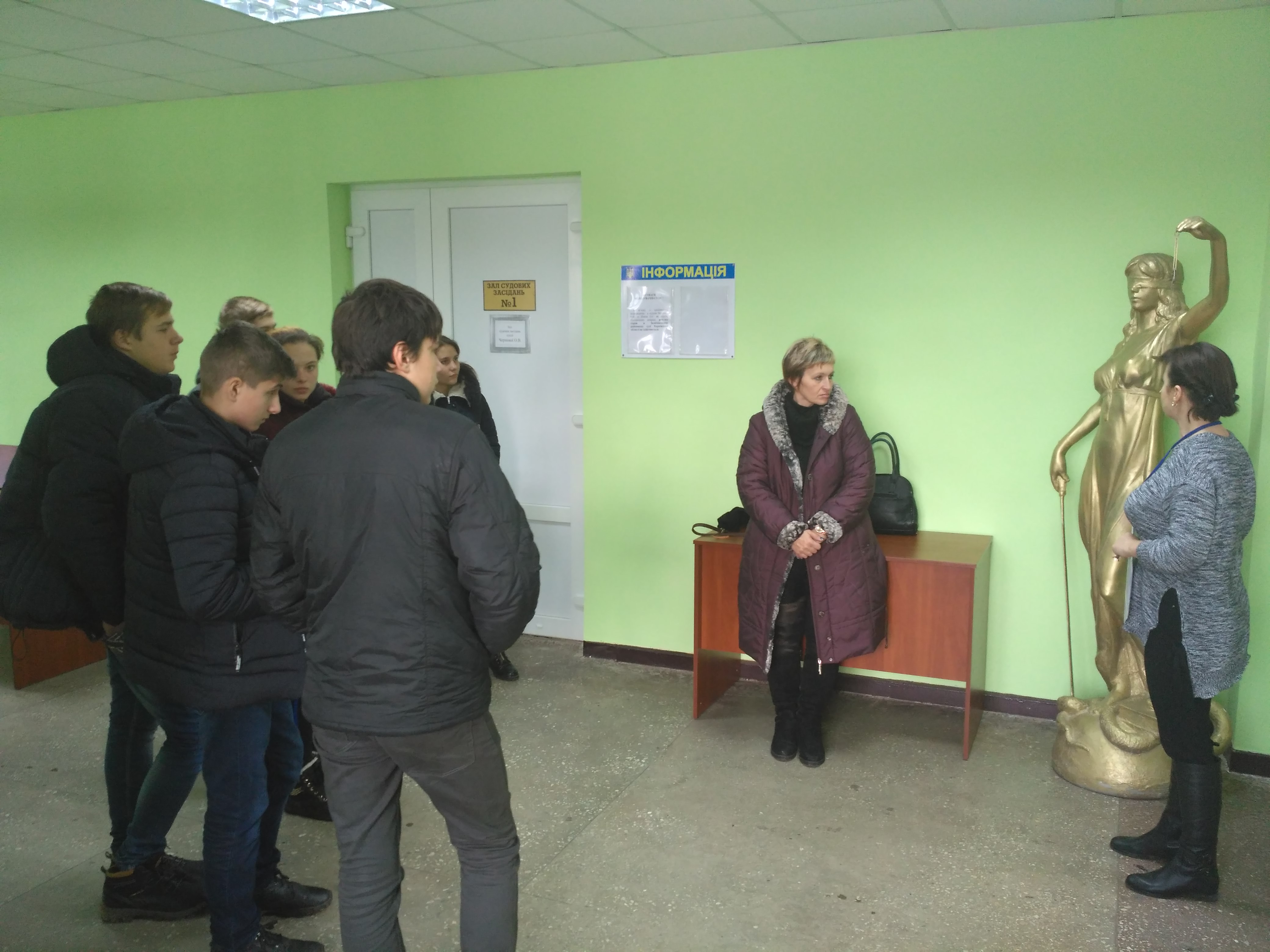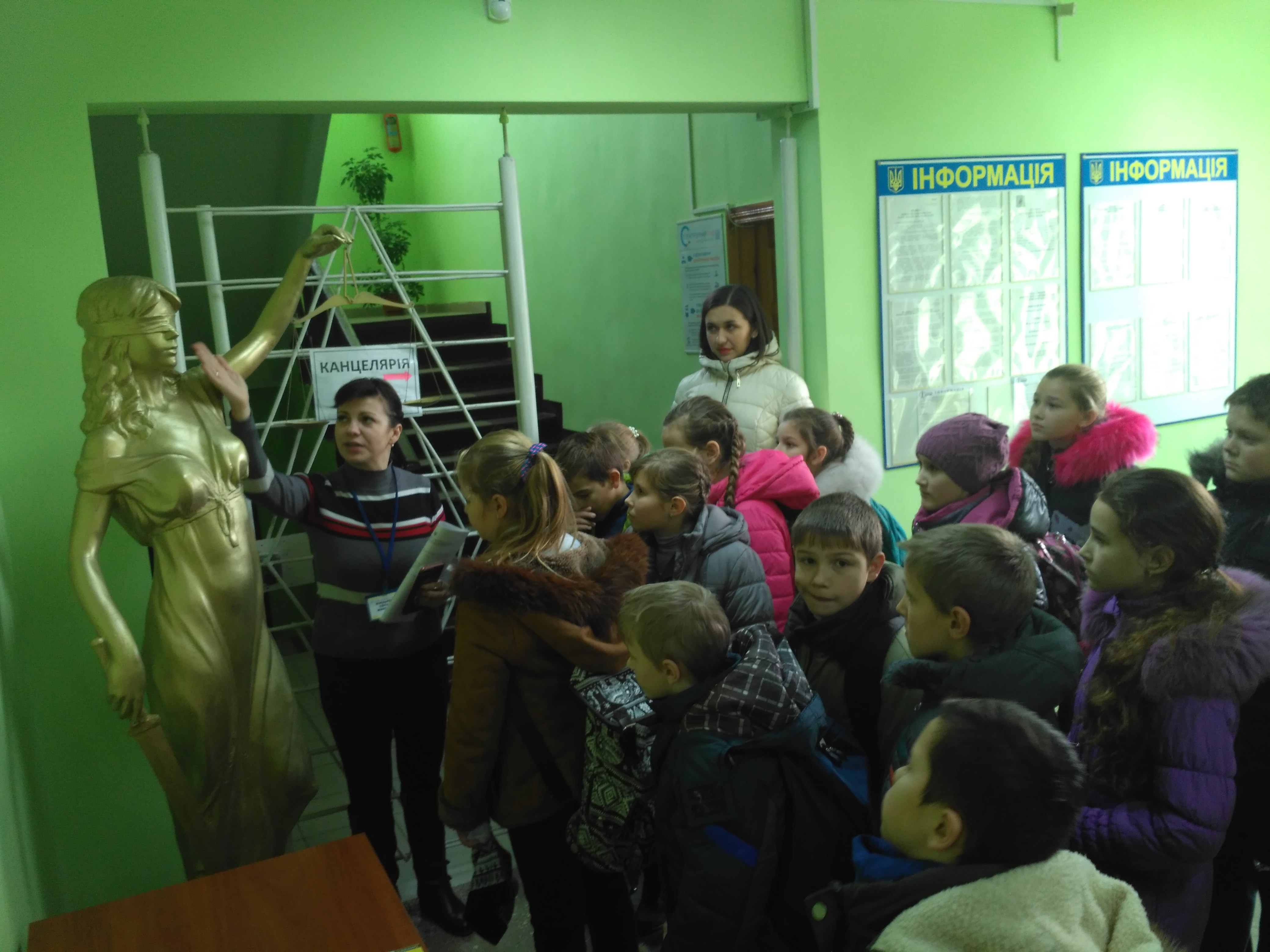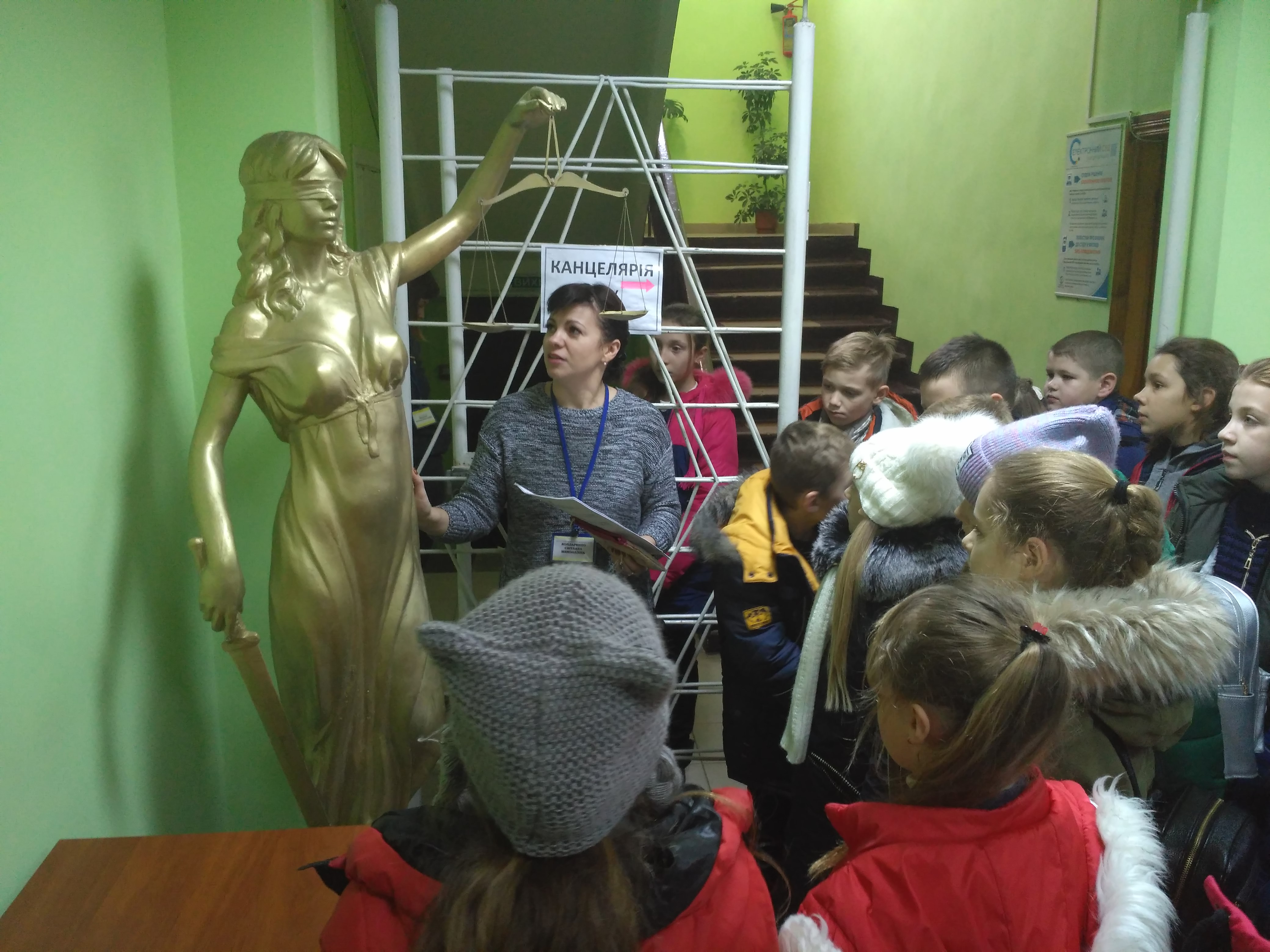 Школярі ознайомлені з принципами роботи суду та суддів, прослухали коротку розповідь про символ правосуддя – давньогрецьку богиню права, законності й порядку Феміду.