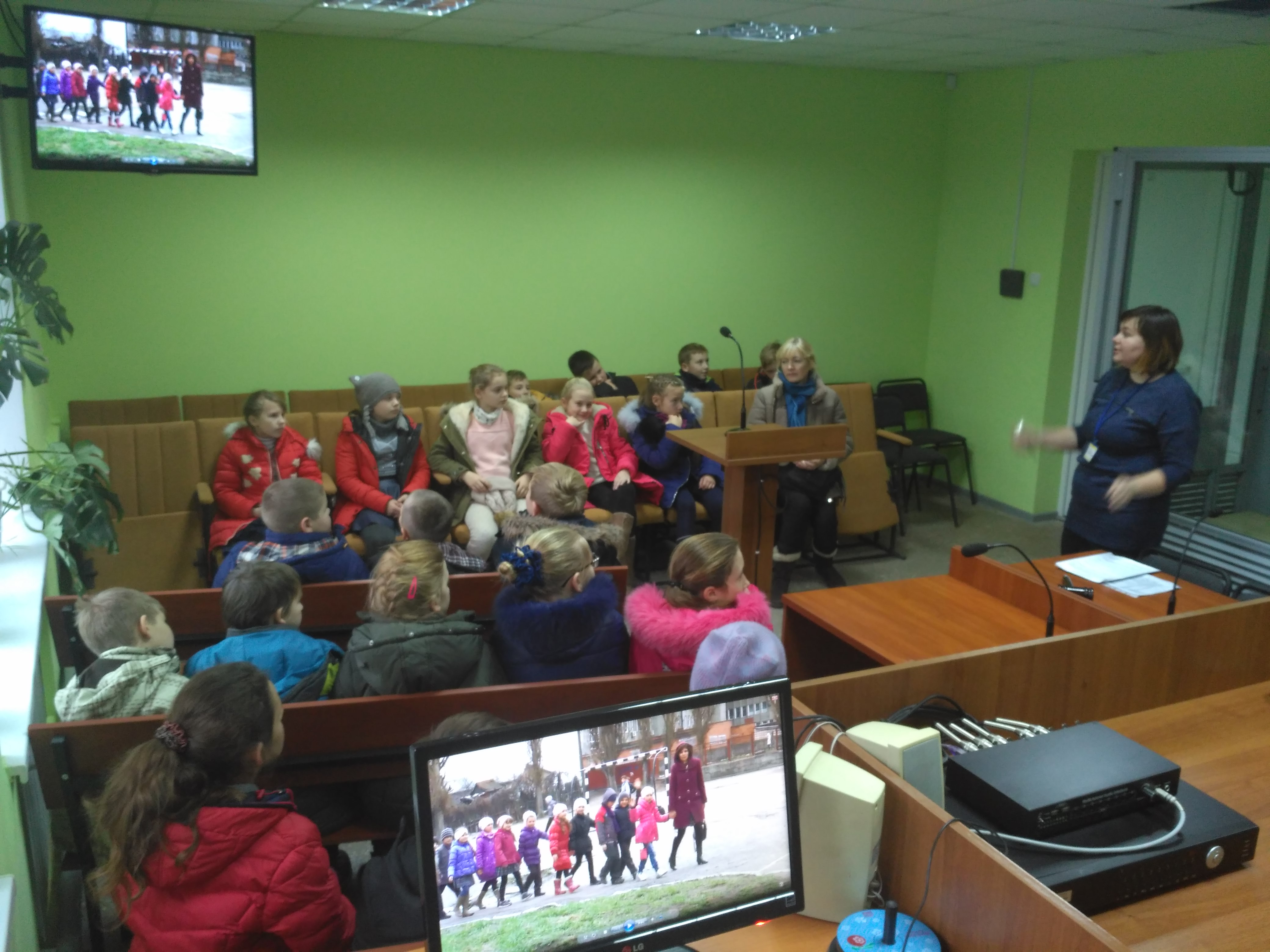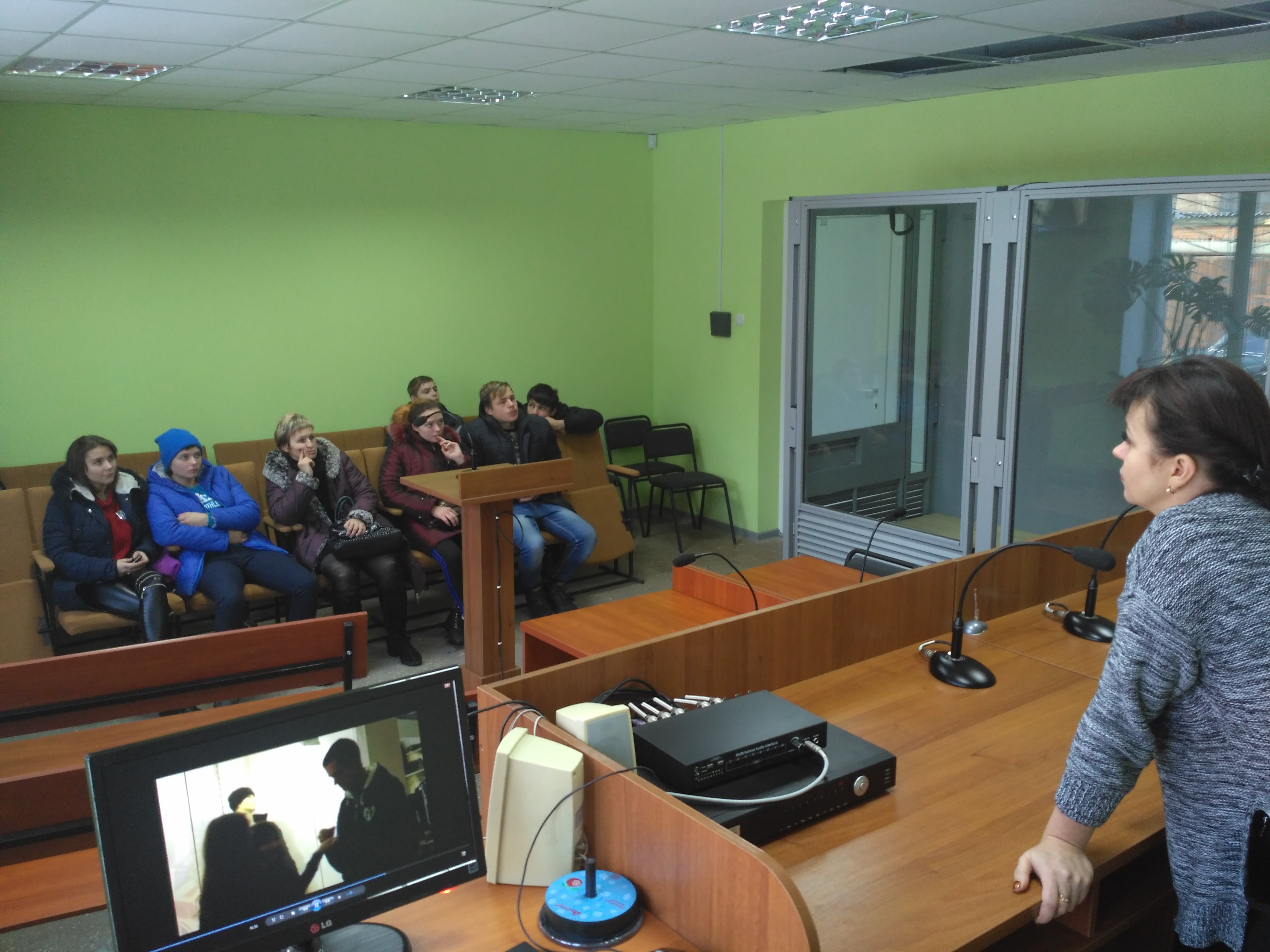 В залі судових засідань діти побачили місце для утримання підвартних за склом. Учні дізналися, що суддя здійснює правосуддя в мантії з надгрудним знаком та суддівським молотком, які є символом влади судді та його правом здійснювати свої повноваження в судовому засіданні.