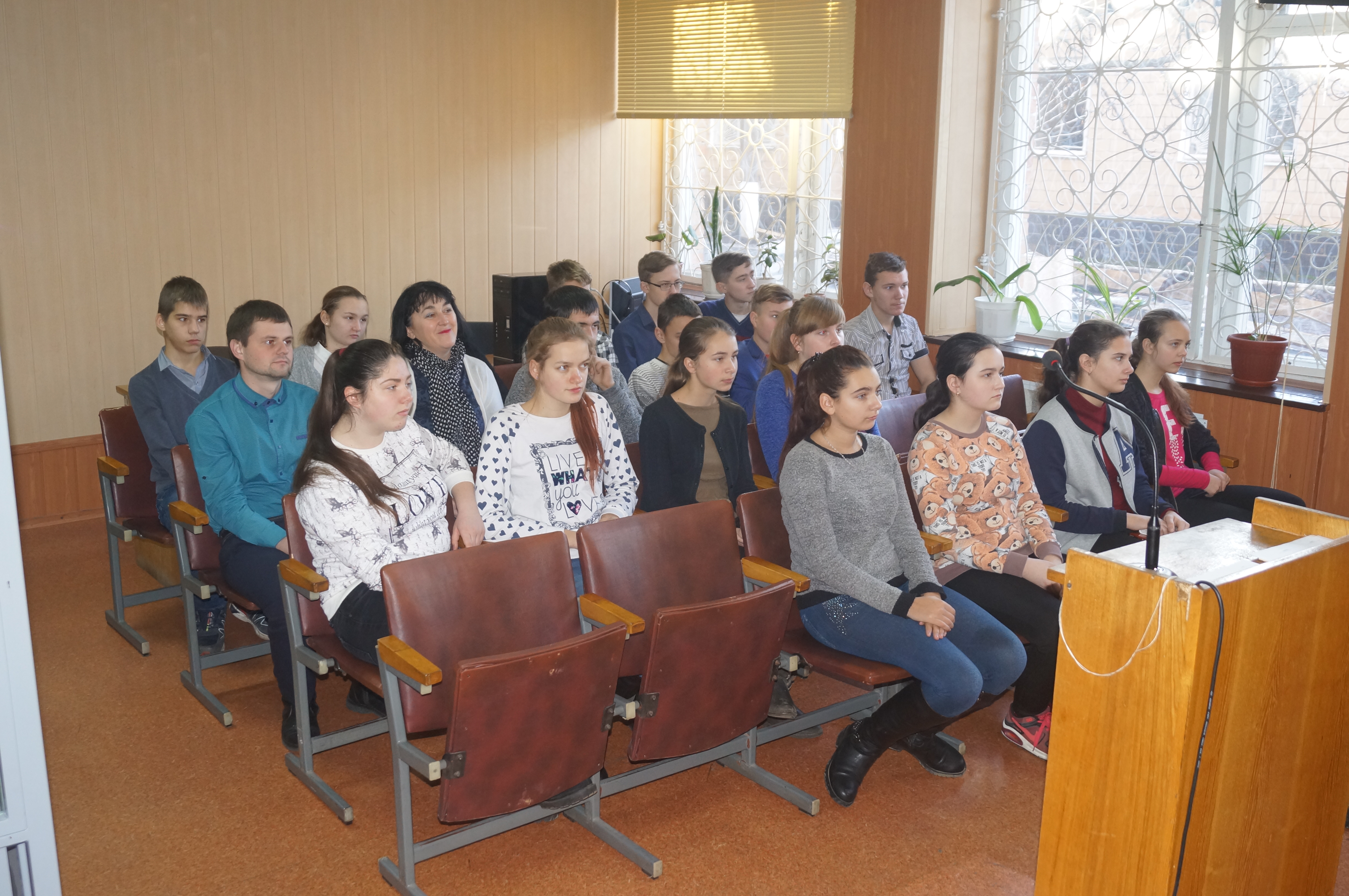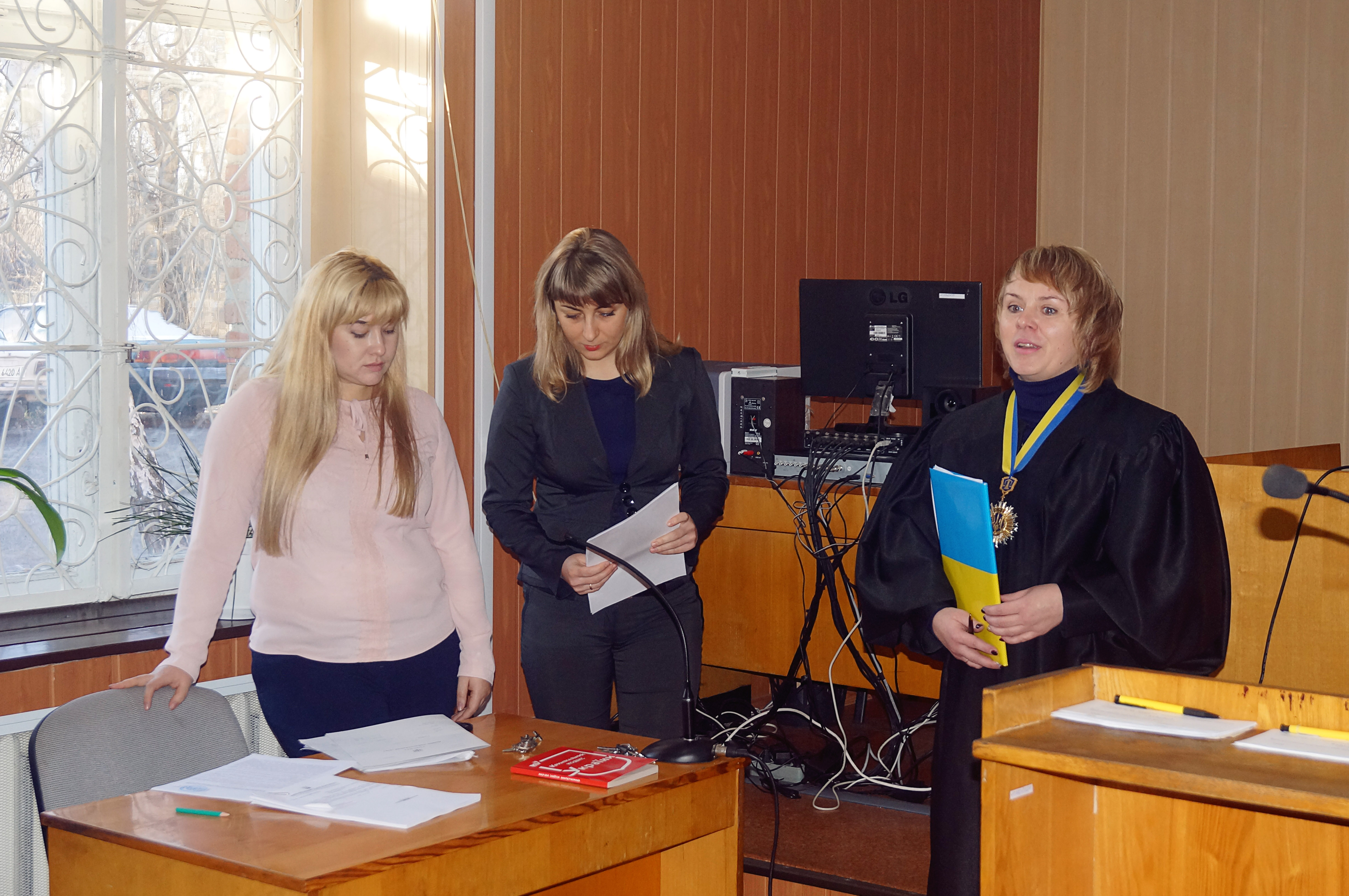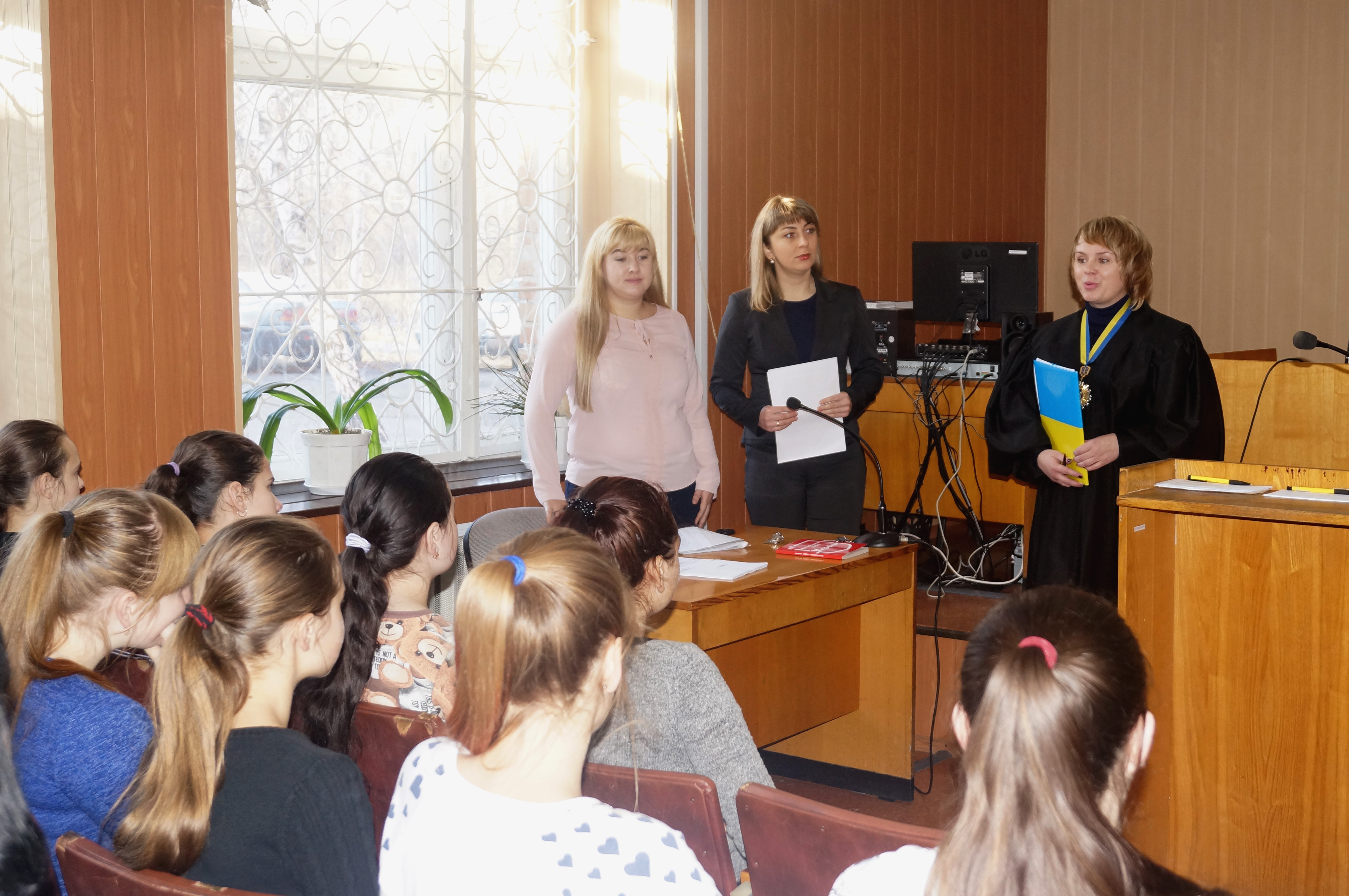 Після цього головний спеціаліст з інформаційних технологій Тетяна Василівна Кирилюк учням продемонструвала можливість проведення судового засідання в режимі відео-конференцзв’язку, його використання забезпечує дотримання принципу гласності та відкритості судового провадження. Проведення слухання в режимі відео конференції заощаджує час та кошти, які витрачаються на доставку особи до приміщення суду, заощаджує час для проведення допиту свідка або учасників цивільної справи, які перебувають в територіально віддаленому місці від місця проведення судового засідання. Для того, щоб судове засідання у режимі відео конференції відбулось, учасник процесу подає відповідне клопотання до суду.