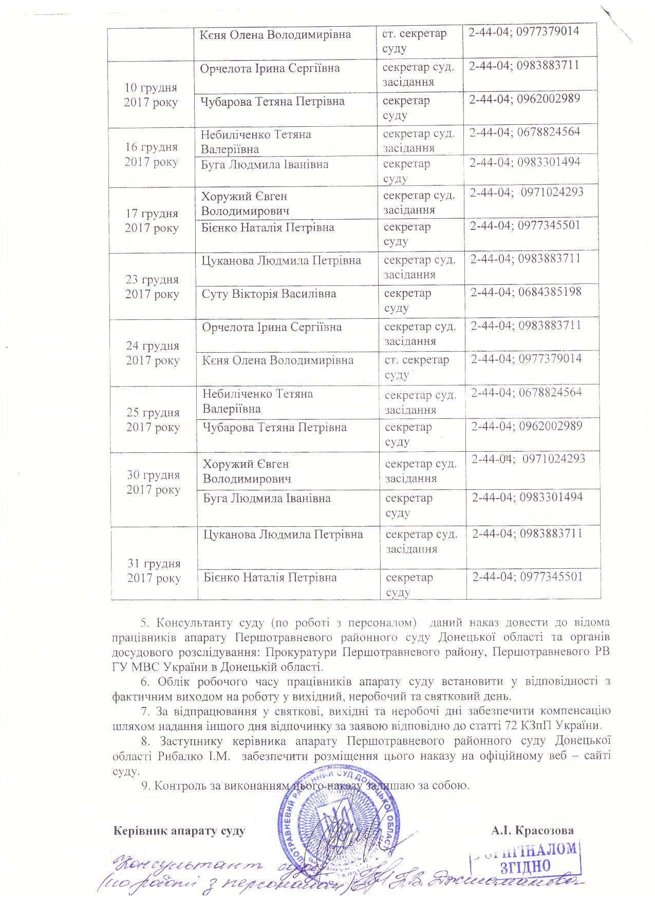 Першотравневий районний суд Донецької області встановив чергування працівників апарату суду у вихідні, неробочі та святкові дні