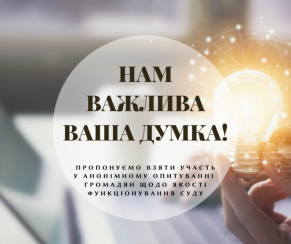Опитування проводиться з метою об’єктивної оцінки якості роботи суду, розробки ефективних рекомендацій щодо поліпшення нашої роботи та підвищення рівня громадської довіри до суду.