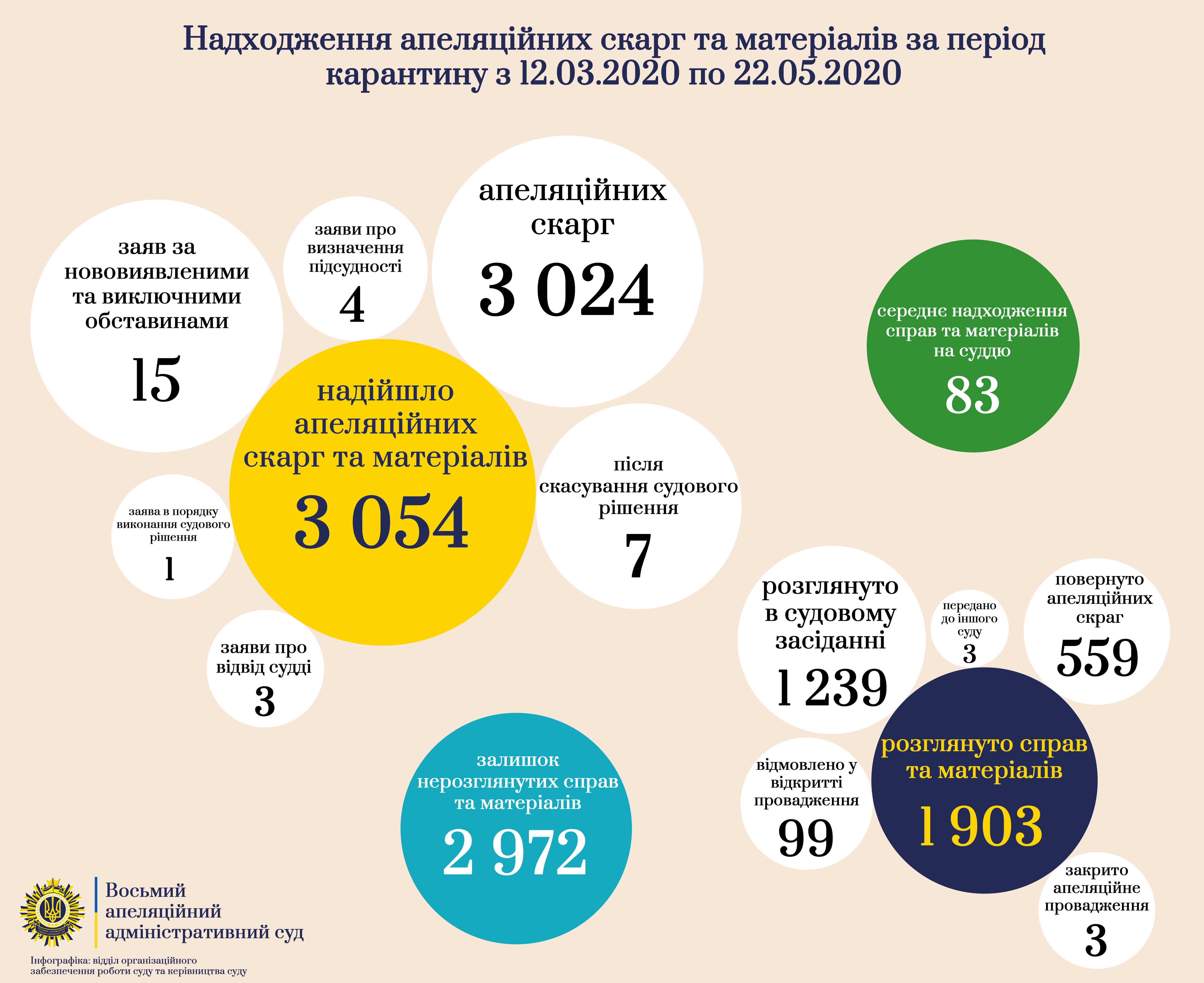 За 72 дні карантину - з 12 березня по 22 травня 2020 року - у провадження суду надійшло загалом 3054 апеляційні скарги та матеріали, з них: