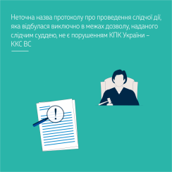 Втім, зі змісту цього протоколу та інших матеріалів провадження видно, що така слідча дія проводилася лише в службовому кабінеті без відома особи, тобто виключно в межах дозволу, наданого ухвалою слідчого судді. Тому те, що працівник поліції склав протокол з назвою «Про результати здійснення аудіо, відео контролю особи» замість «Про результати здійснення аудіо, відео контролю місця», не є порушенням вимог КПК України, яке в силу положень ст. 412 КПК України можна визнати істотним і яке перешкодило чи могло перешкодити суду ухвалити законне та обґрунтоване судове рішення.