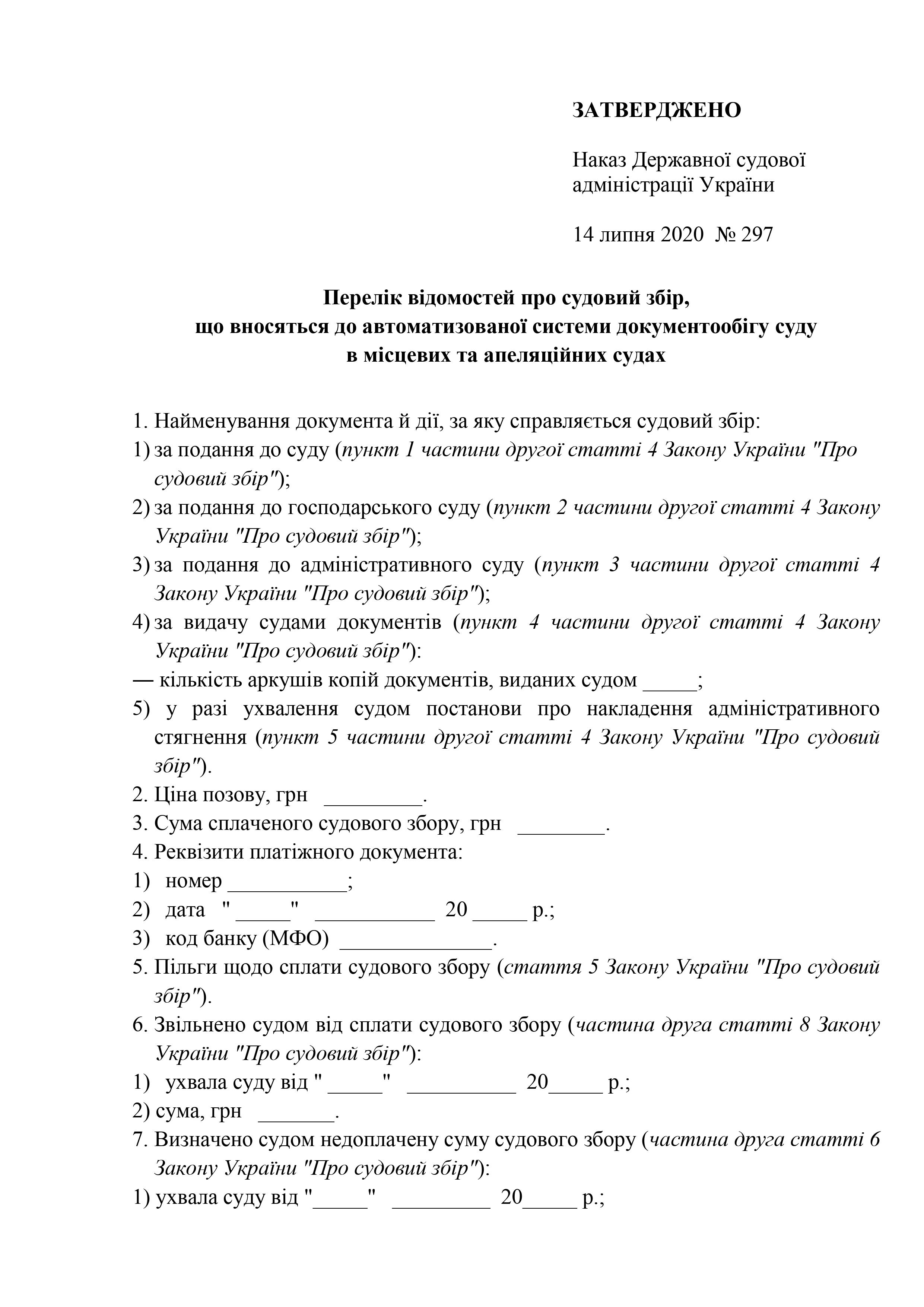 Оприлюднено Наказ Державної судової адміністрації України від 14 липня 2020 року №297 "Про внесення змін до переліку відомостей про судовий збір, що вносяться до автоматизованої системи документообігу суду в місцевих та апеляційних судах"