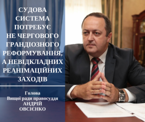 Судова система потребує не чергових грандіозних, але при цьому непродуманих та поспішних реформаторських законів, а нагальних реанімаційних заходів. Про це заявив Голова Вищої ради правосуддя Андрій Овсієнко, виступаючи на VІII Міжнародному судово-юридичному форумі, який проходить 5–6 серпня 2020 року у Києві. Насамперед, за його словами, необхідні законодавчі зміни, які дадуть змогу зупинити деструктивні тенденції відтоку суддівських кадрів та стабілізувати критичну ситуацію із кадровим голодом у судах.