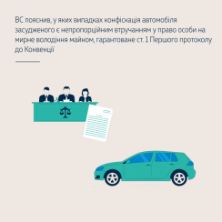 З огляду на викладене колегія суддів касаційного суду вважає, що рішення апеляційного суду про конфіскацію автомобіля є неправильним, оскільки застосування конфіскації в цьому випадку становитиме непропорційне втручання в право особи на мирне володіння майном, гарантоване ст. 1 Першого протоколу до Конвенції.