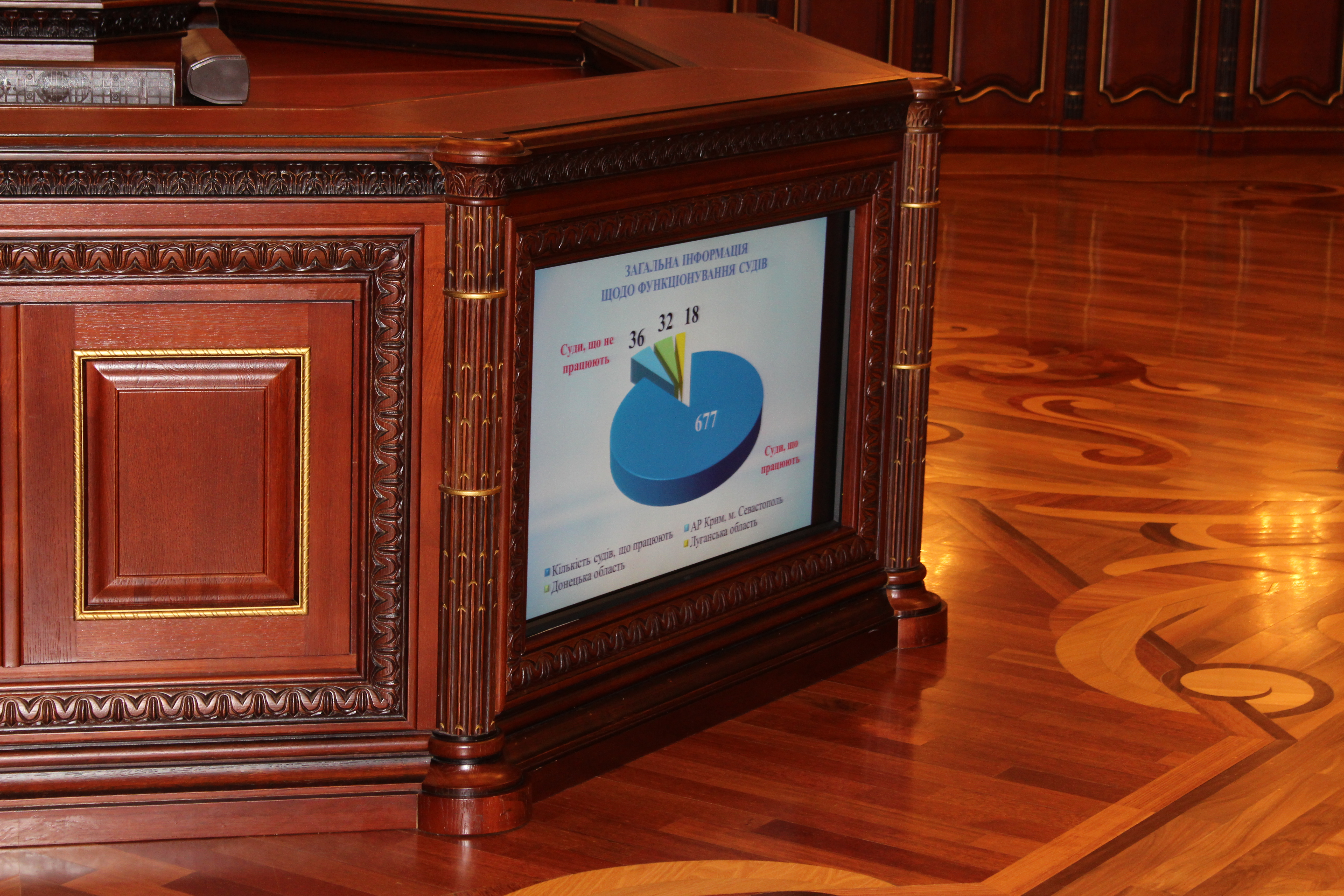 Очільник ДСА України також звернув увагу присутніх на організацію роботи судів, які були виведені з зони проведення антитерористичної діяльності на території, що підконтрольні українській владі. Відтак, у 2015 було відновлено роботу: апеляційного суду Донецької області в м. Артемівську Донецької області; апеляційного суду Луганської області та Луганського окружного адміністративного суду в м. Сєвєродонецьку Луганської області; господарських судів Луганської та Донецької областей, а також Донецького апеляційного господарського суду в м. Харкові. На сьогодні ці суди забезпечено службовими приміщеннями державної та комунальної форм власності, але вони потребують додаткового матеріально-технічного забезпечення.