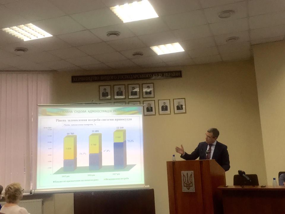 Голова ДСА України зупинився на темпах надходження судового збору по юрисдикціях та інстанціях судів, розповів про основні параметри бюджету судової влади на 2017 рік, поінформував присутніх про оплату праці суддів та працівників апаратів господарських судів, а також повідомив про заходи, вжиті ДСА України у 2016 році, для забезпечення господарських судів належними приміщеннями.